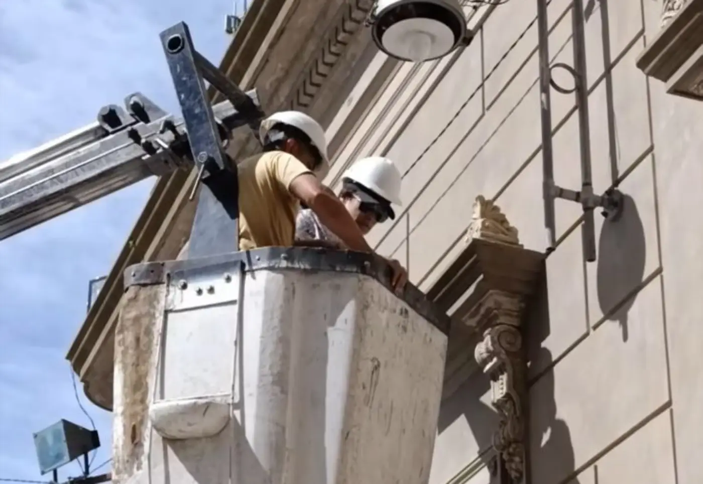En el marco del proyecto de restauración y puesta en valor del patrimonio de la ciudad, la Escuela Taller de Las Flores se encuentra realizando trabajos sobre la fachada del histórico Palacio Municipal.