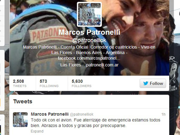 «Todo ok con el avión. Fue aterrizaje de emergencia estamos todos bien. Abrazos a todos y gracias por preocuparse», afirmó hace minutos Marcos Patronelli en su cuenta oficial de Twitter @patronelliok.