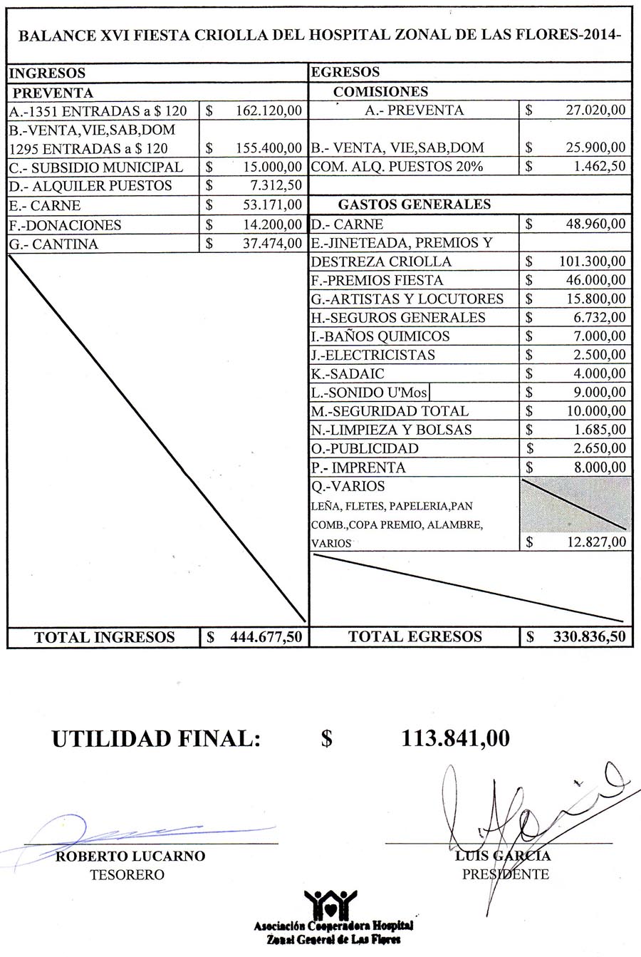 La cooperadora del hospital zonal de Las Flores presentó a los medios el balance de la 16ta fiesta criolla del Hospital 2014. Donde el mismo arrojó que ingresaron 444.677 pesos y egresaron 330.836, quedando para el Hospital neto 113.841 pesos