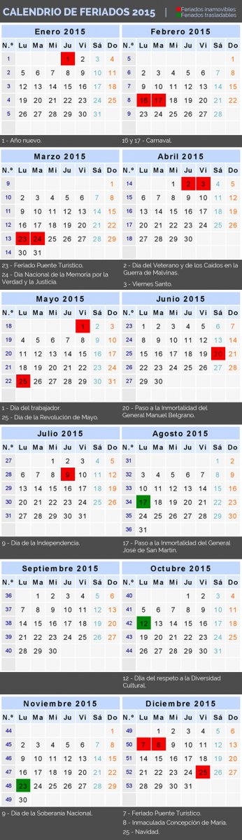 Para este nuevo año habrá dos feriados puente y diez fines de semana largos, dos más que en el 2014 que se fue. Cómo quedó el calendario.