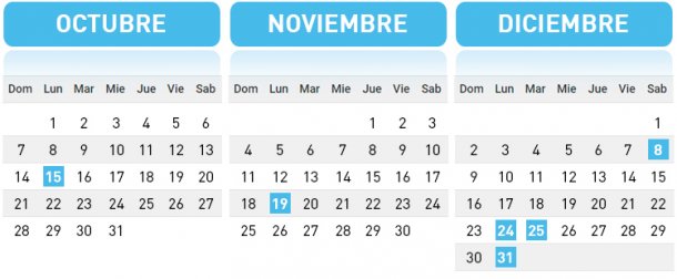 Día del Respeto a la Diversidad Cultural (12/10): del sábado 13 al lunes 15 de octubre, tres días, porque el feriado es trasladado al día 15.
