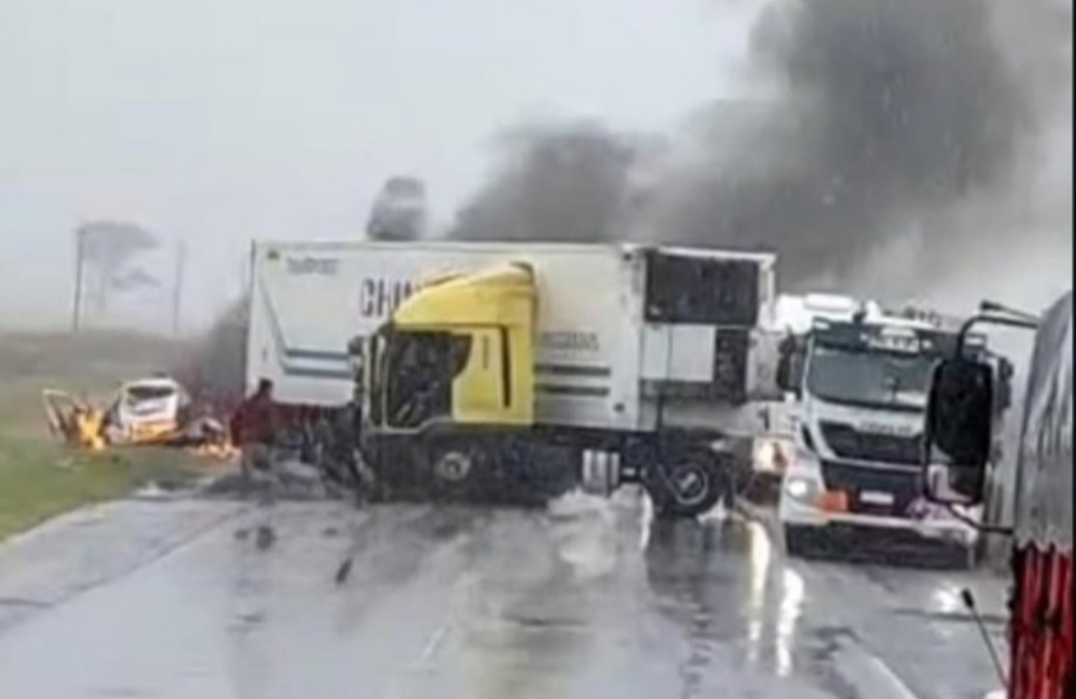 Por causas que aún se investigan, colisionaron un automóvil Renault de color blanco (dominio OUT-454), (patente radicada en Rio Negro) y un camión térmico (dominio DTG-020), radicado en San Andrés (Pcia Bs As). Como consecuencia del violento impacto, el vehículo de menor porte se incendió por completo, quedando su conductor en el interior.