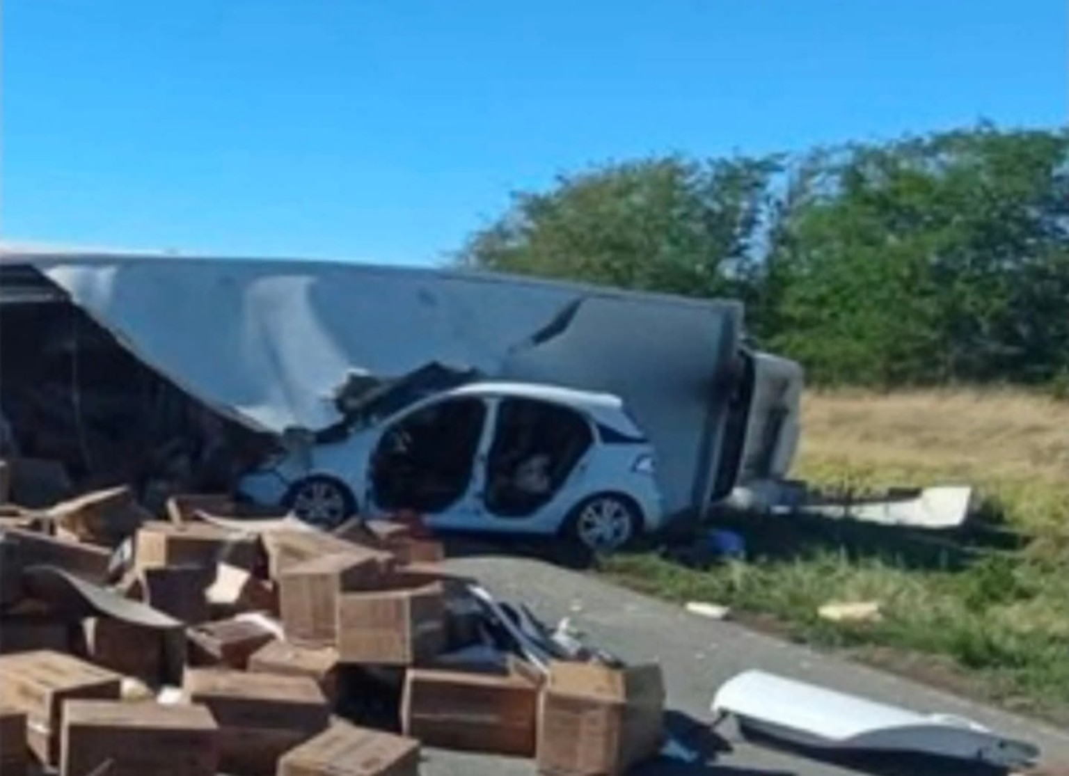 Por causas que aún se investigan, un camión con tráiler volcó y terminó cayendo sobre un automóvil Chevrolet Onix que circulaba por el lugar.