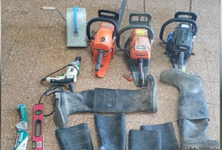 Los elementos recogidos son los siguientes:• un serrucho de poda curvo, marca Total, con hoja de 13 pulgadas de largo y mango de plástico o material similar, color gris y verde;• un nivel de mano, marca Dogo, de 60 cm de largo, color rojo;• una motosierra marca Niwa, color naranja, de 45 cm³, N° de serie 1E43F211106356, con espada de 50 cm de longitud;• una motosierra marca Daewoo, de 52 cm³, color naranja y gris, N° de serie GBRLK02064, con espada de 50 cm;• una motosierra marca Gamma, de 52 cm³, color negra con azul, N° de serie 0242402092, con espada de 45 cm de largo, con grabado en hoja B18-72-5810P;• un salpicador de material de chapa galvanizada o similar, con grabado en relieve FP;• un taladro percutor de mano, marca Salkor, modelo TPP 1300, color crema y gris, con mecha colocada;• tres pares de botas de goma para agua, color negro, marca Super Max, dos pares talle 41 y uno talle 43;• un par de botas de goma marca Damalu, color negro, talle 42.