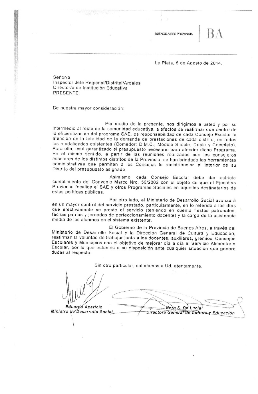 En la notificación que hizo llegar la Dirección General de Cultura y Educación de la Provincia a todos los inspectores, jefes regionales, ditritales y areales, se indica «está garantizado el presupuesto necesario para atender» el programa SAE. Pide además que «cada Consejo Escolar debe dar estricto cumplimiento del Convenio Marco nº 56/2002 con el objeto de que el Ejecutivo provincial focalice el SAE y otros programas sociales en aquellos destinatarios de estas políticas públicas».